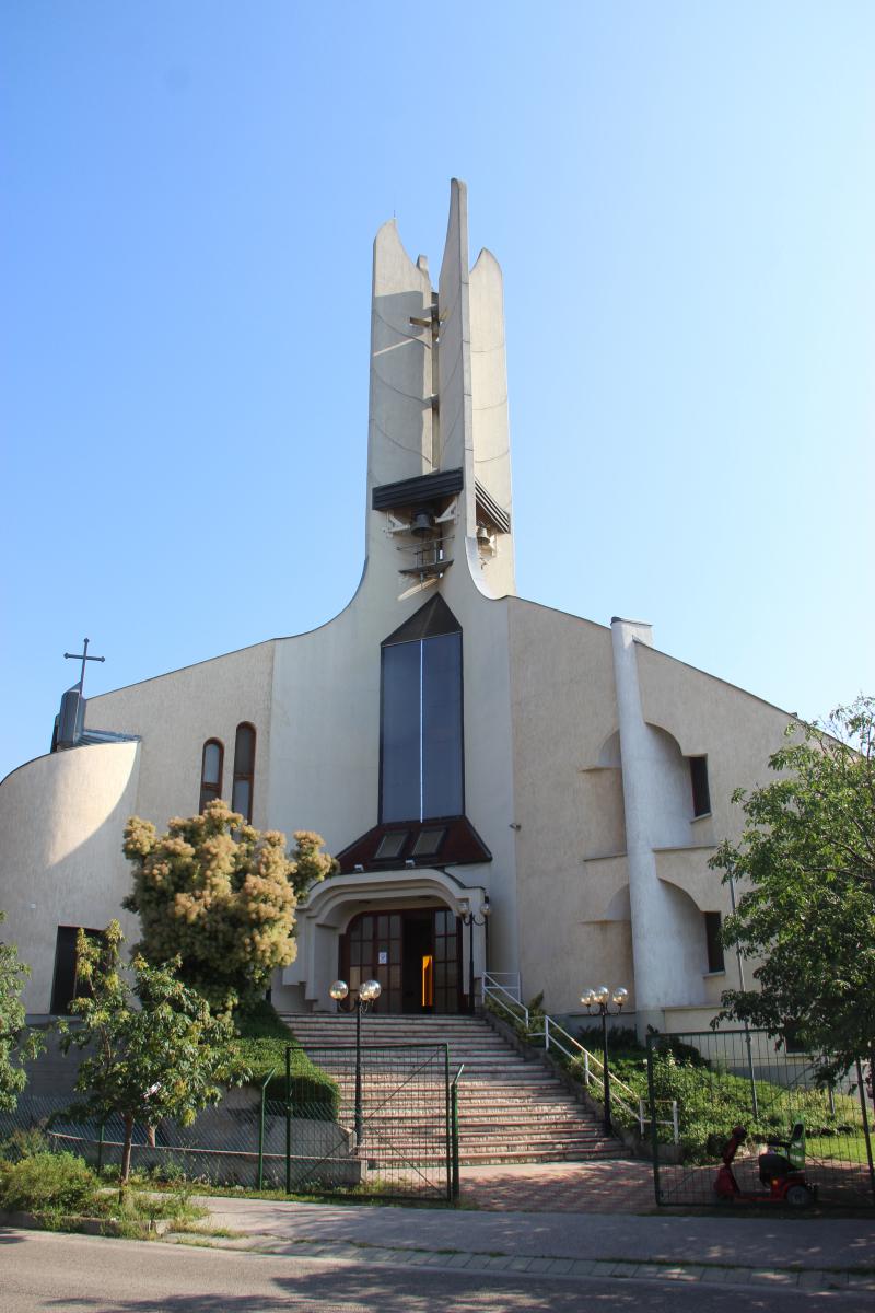 A jogutód plébániatemplom építésére Hajnal György atya 1990-ben kapott megbízatást Paskai László bíboros úrtól. Az építtető célja volt mindazt megformázni, ami feladata egy templomnak: biztonságot és erőt adjon, a magasba törjön. Ezt jelzi a 33 méter magas pengetorony. Már mérete is jelkép, Jézus földi életének az idejére utal, másrészt pedig a szeretet lángját, a gyertyalángot formázza meg. Mint ilyen jellegű forma, az első pengetorony a hazai templomépítészetben. A tornyban három harang lakik, melyek szívei az alábbi hangokat ütik:
