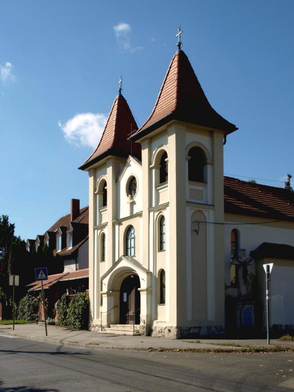 Története: a XVIII. század végén a Virágvölgy és Péterhegy környékére települt német lakosság egy népi barokk kőfeszületet hozott magával, és a Péterhegyi út szélén állította fel. 1932-ben ráccsal vették körül, majd a körülötte vásárolt telekrészen kápolnafülkét építettek. Ez lett a kiindulása az 1932-ben megalakult Budapest-Péterhegyi Szent Szabina Kisegítő Kápolna Egyesületnek. A Szent Szabina név felvételét az sugallta, hogy az Árpádok korában e hely közelében, a mai Kamaraerdő dűlőben virágzott a Szent Szabina bencés apátság, amelynek romjai műemlékileg védettek. 1934-ben épült a mai kéttornyú templomocska (56 m2), amelynek jobb oldali toronyfülkéjében helyezték el a kegyelettel körülvett kőkeresztet. A kápolna lelki ellátását a kelenföldi plébánia biztosította, amelynek területén állt, és amely a telket az egyházközségre telekkönyveztette. 1943-tól a kápolna lelki vezetője Körmendy Béla szatmári egyházmegyés pap volt, aki liturgikus központot igyekezett itt kialakítani. Meghívására gyakran tartott liturgikus előadásokat és lelkigyakorlatokat dr. Szúnyogh Xavér OSB, akit 1950-től az egyházi főhatóság megbízott a kápolna vezetésével.