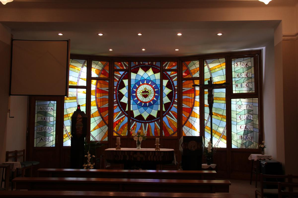A hetvenes évek végén a kápolna egy nagy fogadószobára emlékeztetett, de azóta többszöri átalakításra került sor. Az 1999-es átalakítás során sikerült a kápolnához csatolni a kertre tekintő teraszt, és ezzel egyidejűleg a belső teret egy üveg oltárképpel zárták le. Az ólomüveg oltárképet, amelyet Blanckenstein Miklós püspöki helynök szentelt fel 1999. október 11.-én, Bráda Tibor Munkácsy-díjas festőművész tervei alapján Mohai Attila kivitelezte. A feszület Szöllősy Enikő munkája. A tabernákulumot és az oltárt tűzzománccal borított lemezek díszítik. A kápolna befogadóképessége mintegy 12O fő.