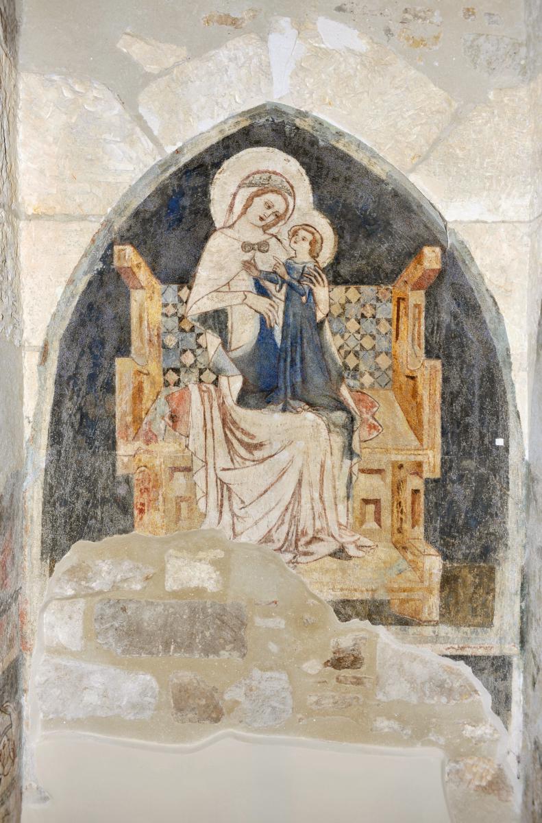 A XIV. században alakították ki a szentély-körüljáró folyosót. Ennek közepén, a templom főtengelyében található fülkében látható a Trónoló Madonna freskó. A XIV. század elejére datált freskót a 2010-es restaurálási munkálatok folyamán fedezték fel. A fülke oldalfalán püspökszent (valószínűleg Szent Gellért püspök) ábrázolása látható. A szentély-körüljáró gótikus ülőfülkéi a XV. században freskódíszítést kaptak. Ekkor építették át a templomot gótikus stílusban. Az ülőfülkék eredeti kőelemein helyenként látszanak a középkori festés maradványai, melyek Krisztus szenvedéstörténetét örökítették meg.