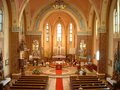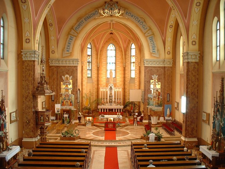 1955. november 13.-án pápai engedéllyel templomunknak Nagyboldogasszony lett a védőszentje. Búcsúja: augusztus 15.-én van. Eredetileg tiroli faoltárok voltak a templomban. A főoltárt 1952-ben cserélték ki márványoltárra Árkai építész tervei alapján. A főoltár fölött a Szűzanya Szappanos Béla pap szobrászművész alkotása. A jobboldali mellékoltáron a magyar szentek: Szent Erzsébet, Szent István és Szent Margit láthatók. A baldalon pedig a Szentcsalád oltára van. A kórus alatt a Szent Rita szobor Jálics Ernő munkája.